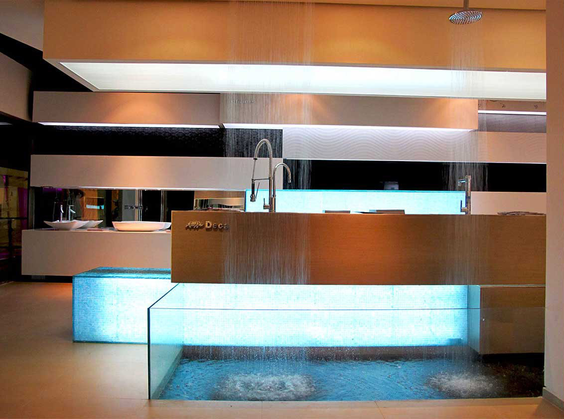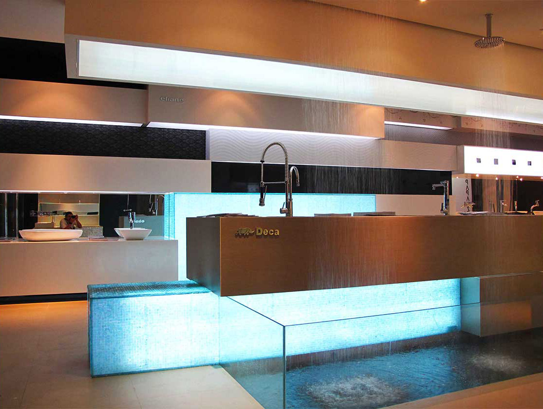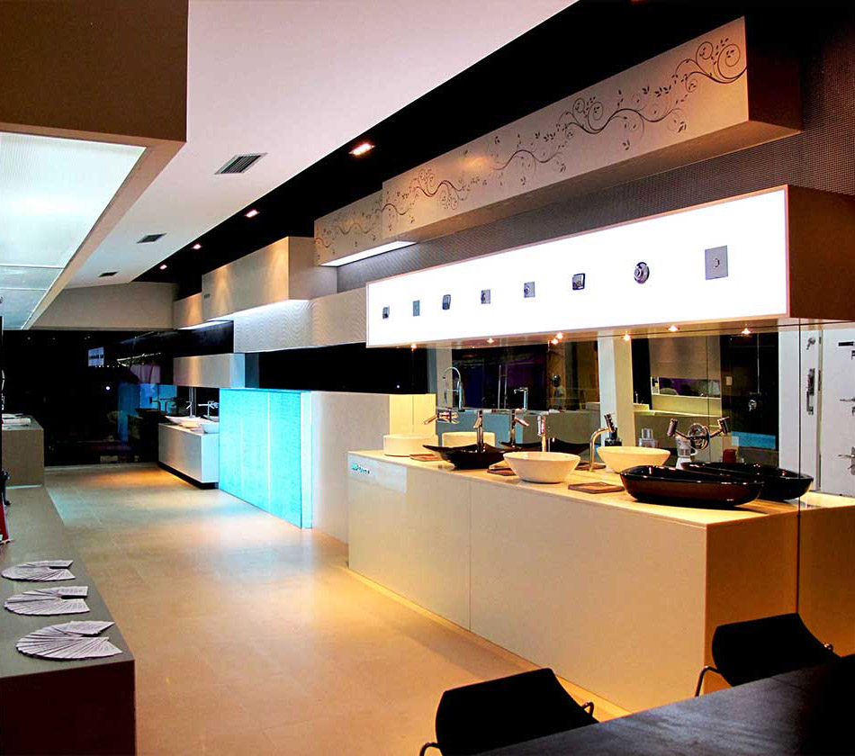La idea principal es lanzar las últimas líneas de diseño de las marcas que representa la empresa y mostrarlas de una manera impactante y muy contemporánea, resaltando la calidad de los nuevos materiales, sin que caigan en monótonos muestrarios de productos. Los volúmenes entrantes y salientes, están dimensionados en proporción de cada pieza a ser expuesta, cada caja muestra un material, ya sea una cerámica, porcelanato o cualquier tipo de revestimiento en su tamaño real, sin tener que hacer cortes para no desvirtuar las piezas. De esta manera, jugamos con las formas y las proporciones de los materiales a ser expuestos y al tener este movimiento de cajas que entran y salen, la luz también lo hace, creando este juego de cajitas luminosas, brillantes y llamativas. Los mismos volúmenes generan espacios de apoyo para el resto de productos como los artefactos sanitarios y griferías, imitando así espacios de baños, extraños pero atractivos. No solo juegan y son protagonistas las formas y los materiales sino también la luz y el agua.