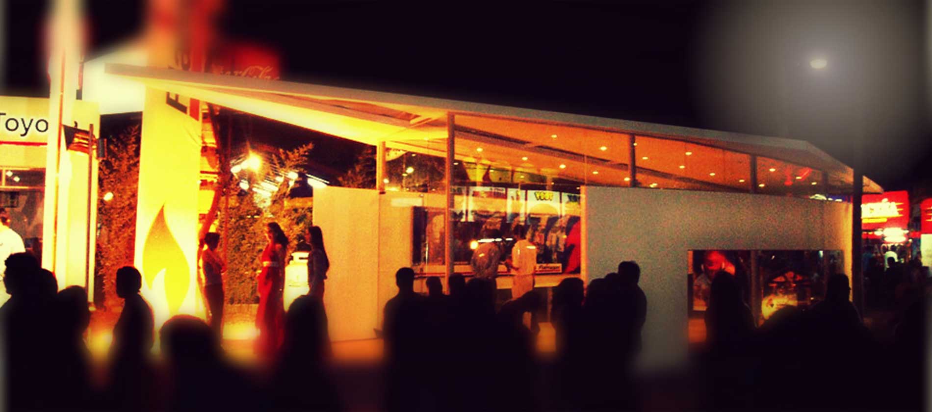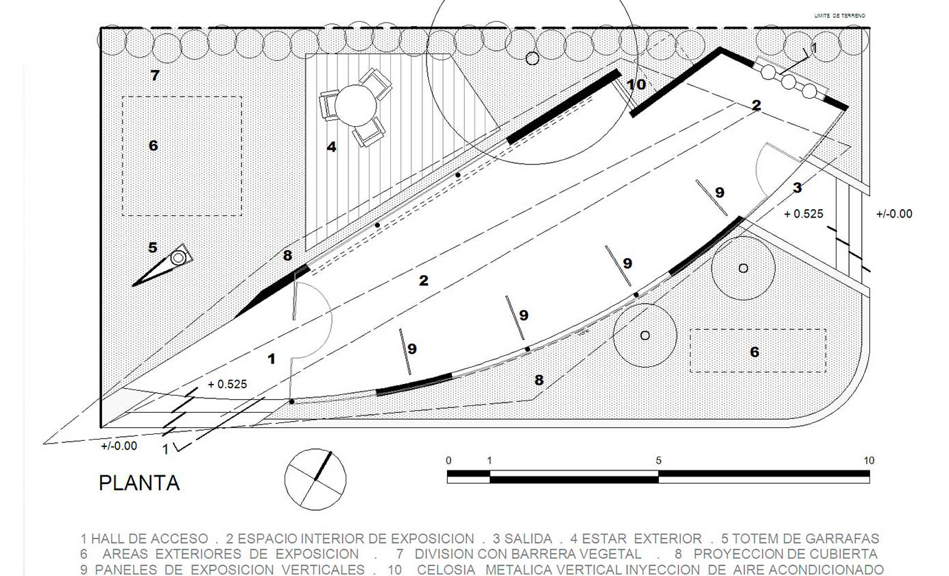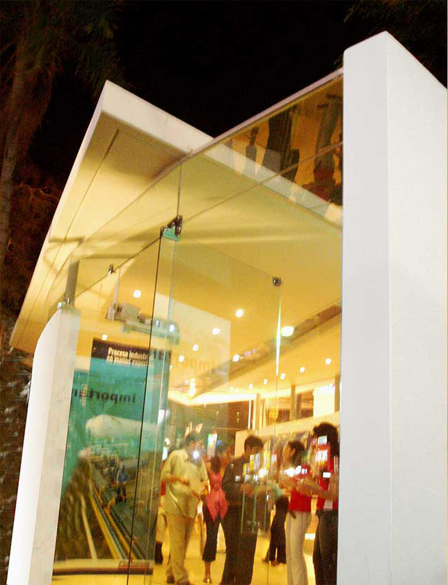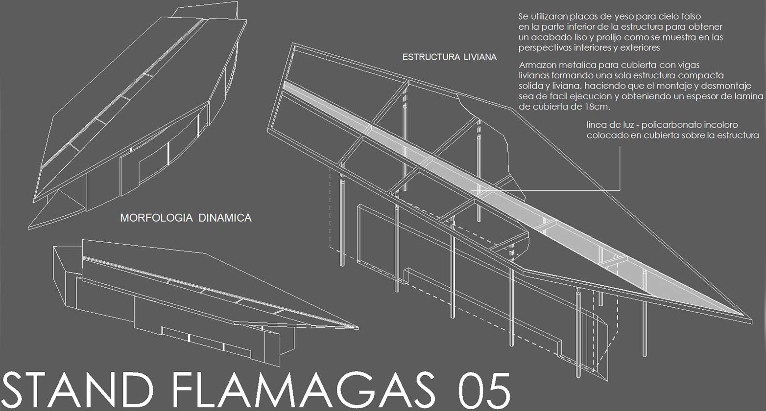 Se ha propuesto una solución tan aparentemente sencilla como contundente. Está concebido bajo una estructura de cubierta vistosa y ligera, conformada por un plano fugado atravesado por una ranura vidriada, que promete traer el cielo dentro del stand. Bajo esta gran cubierta se resuelve una geometría variable que acoge un monoambiente donde se desarrolla la exposición principal en paneles ligeros y casi virtuales con graficas explicativas de los productos y servicios que Flamagas ofrece. La parte publicitaria externa se resuelve con un tótem de garrafas que se fusiona con un plano envuelto en una banderola como hito que marcará la presencia vertical de Flamagas en esta muestra ferial. Así proponemos una intervención de alto impacto visual dotada de dinamismo gracias a una proyección panorámica que completa una pro- puesta enteramente visual para resaltarla del resto de los stands. Como objetivo se propone lanzar una imagen seria pero vanguardista, situar a la empresa Flamagas como tal, empresa sólida y de punta.