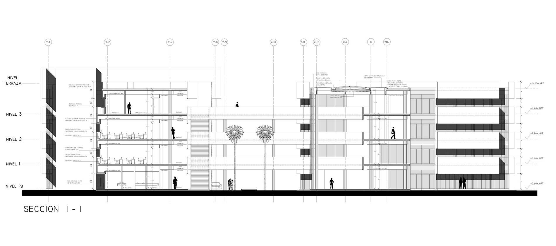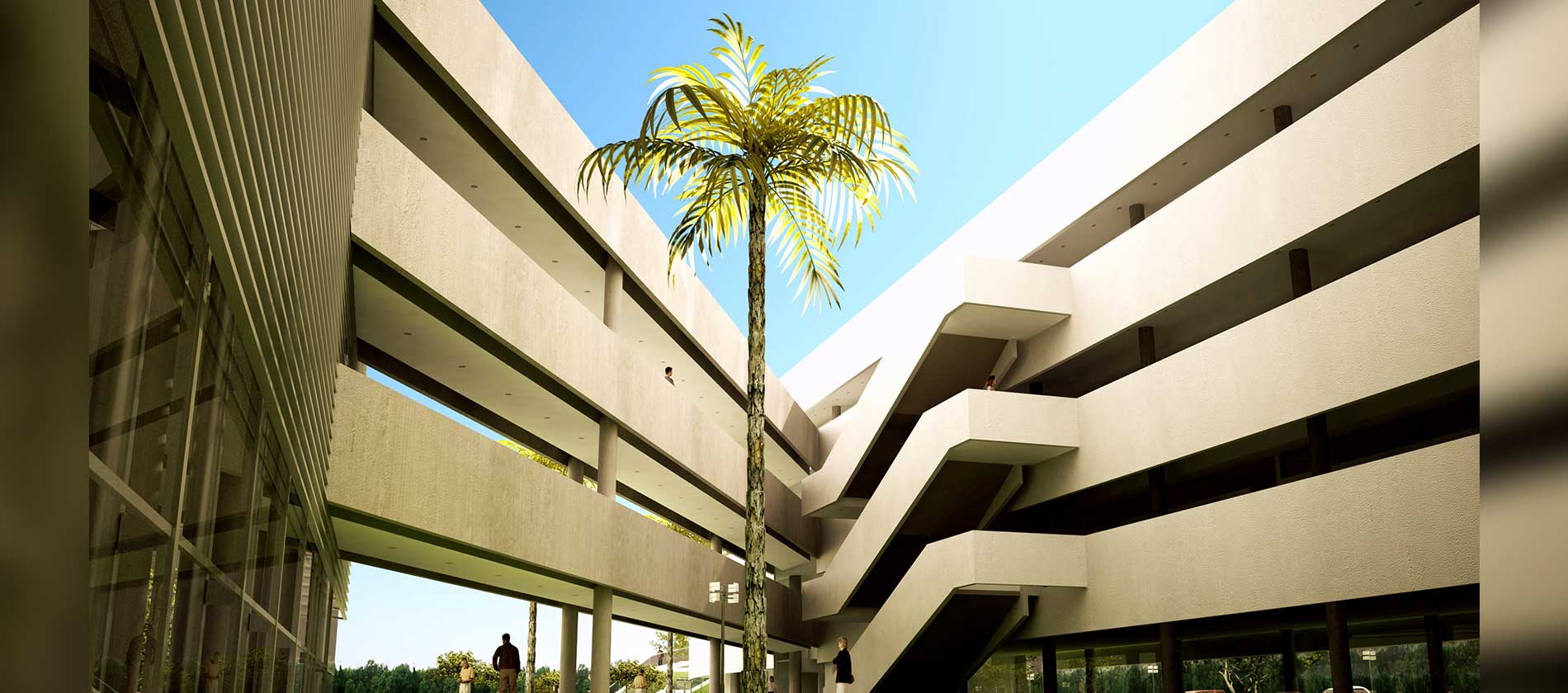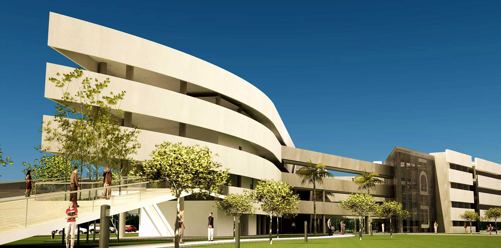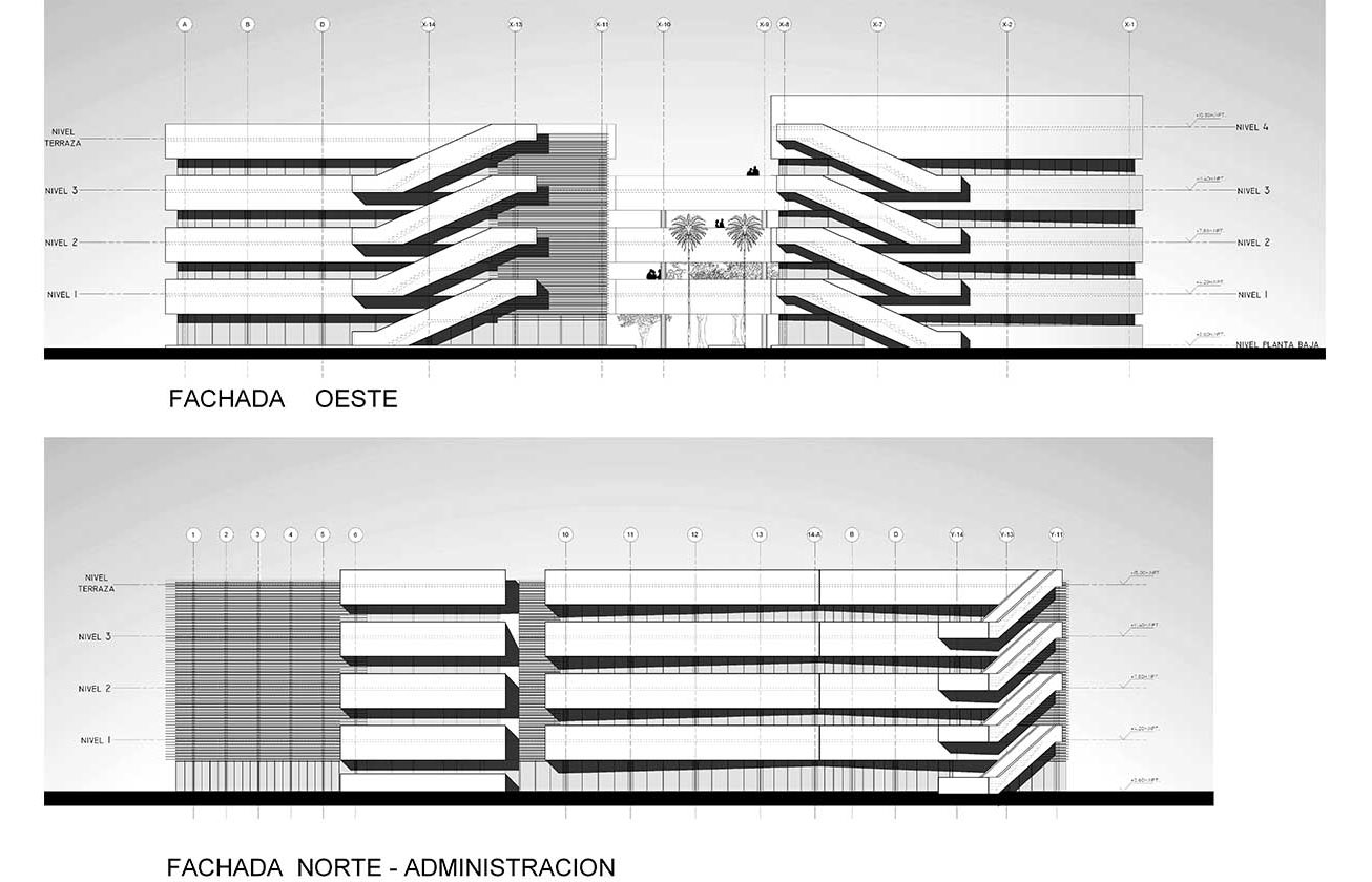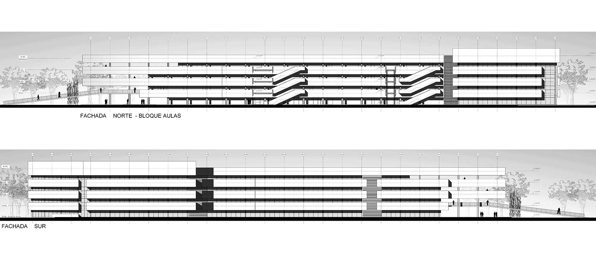 El comitente, una Universidad técnica extranjera con sede en Chile y dependiente de la Universidad Católica de Chile nos transmite su programa, bastante complejo y exigente por tratarse de una universidad a nivel técnico y con carreras nuevas y jóvenes para nuestro medio. El terreno es un lote con una interesante ubicación en la zona del cuarto anillo cercana al borde ecológico del rio Piray, en frontera inmediata con la zona suburbana del Urubo, zona de gran crecimiento y desarrollo de grandes proyectos inmobiliarios y comerciales, entorno que promete consolidarse como zona activa y de mucha vida urbana y actividad social. El exigente programa, de compleja composición, sobre todo por la cantidad de movimiento humano que generará, nos motiva a plantear un funcionamiento general sencillo y amable, de grandes recorridos peatonales, con plazas y áreas verdes, y aprovechando hermosas vistas al bosque del Urubo, a manera de refrescar las sensaciones de libertad del estudiante cada que tenga un escape de clases.La superficie total del programa exige al menos once mil metros cuadrados, entre aulas, oficinas, circulaciones, talleres y auditorios, lo cual debe ser contenido en un edificio de no más de cuatro niveles de altura, así las circulaciones son eminentemente peatonales.El esquema general se reduce a un funcionamiento básico y sencillo, definido en dos bloques principales dejando un importante espacio intermedio que hará de patio interno, hall alargado de bienvenida y circulación y además nexo y articulador del movimiento que se generará en el interior del conjunto y sus alrededores, que van a contener la vida universitaria. Al final entre los bloques y el espacio interno, se constituyen en uno solo, por su vinculación clara en todos los niveles que hacen que ningún espacio del conjunto quede aislado. En consecuencia resulta un solo cuerpo, pero con muchas vías respiratorias.Proponemos el acceso principal peatonal desde la avenida principal, futura avenida costanera, con un gran espacio verde anterior al primer bloque de aulas, que hemos retirado deliberadamente más de 30 metros des de la calle para darle mayor importancia al recorrido peatonal que comienza a mostrarse mucho antes del primer bloque con una gran rampa peatonal que dará elección al estudiante de entrar por abajo o por encima directamente hasta el primer nivel, recorriendo la rampa y elevándose dentro del propio conjunto. Los recorridos peatonales en planta baja, a través de amplias áreas verdes están intencionalmente colocados desde el ingreso y recorren todo el conjunto sin ningún tipo de limitante formal o funcional. El esquema general se presenta más lineal y suelto que compacto, siguiendo la premisa de circulación horizontal, alargada y dinámica. Determinamos la función de una manera práctica y sencilla, creando dos bloques contenedores, uno que será el bloque académico, con aulas, auditorios y talleres y otro menor, donde se dispondrá la parte administrativa y oficinas. De esta manera, separamos las funciones académica y administrativa, pero al mismo tiempo las vinculamos por una serie de puentes externos que mantendrán unidos estos bloques para que se mantenga un conjunto unitario de aspecto, pero con funcionamientos internos diferentes. El planteamiento lineal y con los vértices de los bloques apuntando al oeste, hacen que la parte más larga, o sea la mayoría del cuerpo de los bloques quede protegido del soleamiento molesto. En adición, los aventamientos en el bloque de aulas, está orientado de oeste a este para recibir ventilación cruzada de los vientos dominantes. Las superficies vidriadas están limitadas al mínimo para recibir luz y vientos necesarios y reducir costos de construcción y refrigeraci& oacute;n. En su mayoría el material predominante es el hormigón armado y la mampostería, garantizando durabilidad, solidez, bajo costo de mantenimiento y construcción. El resultado es un conjunto compuesto, pero unificado, contundente y funcional.