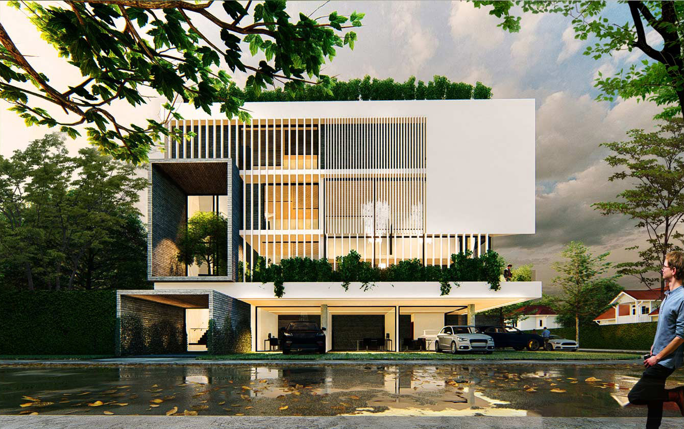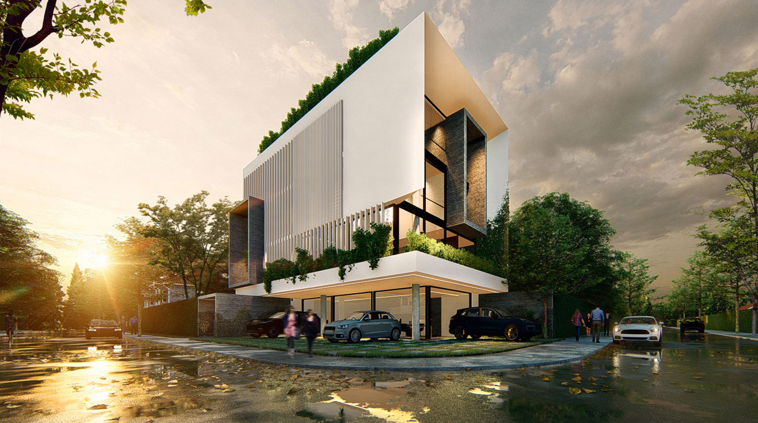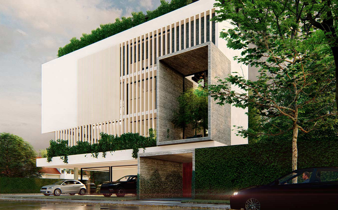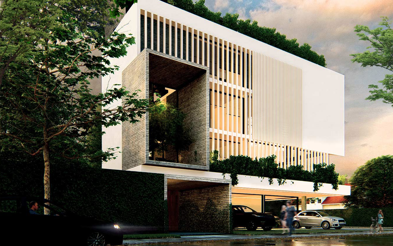 El edificio cumple las funciones de vivienda y comercio en planta baja, se implanta en un terreno compacto de solo 350m2, aprovechándolo al máximo y aportando con densificación media al tejido urbano de la zona.
